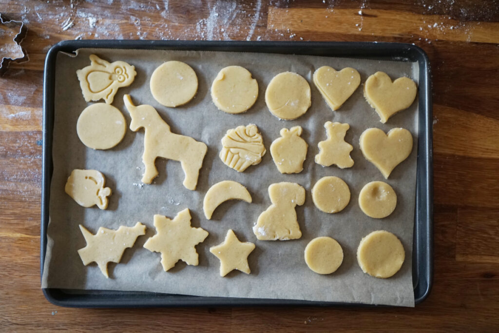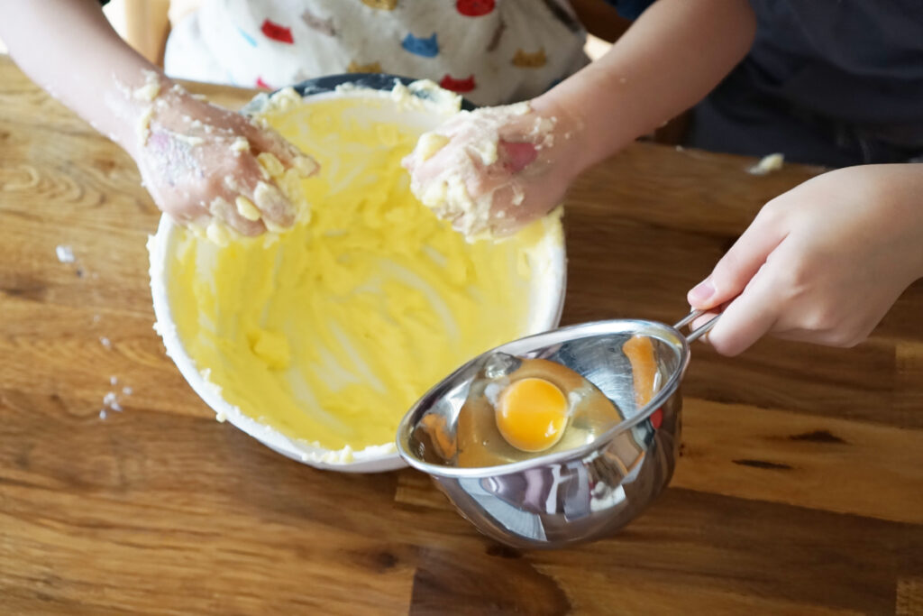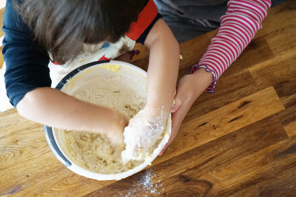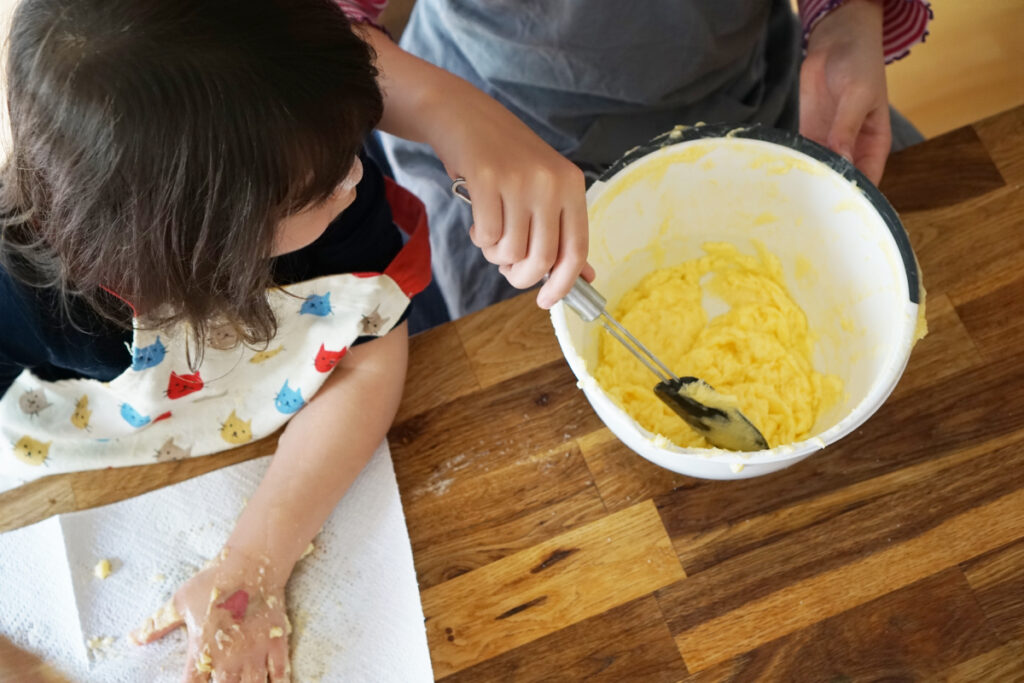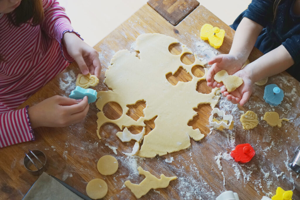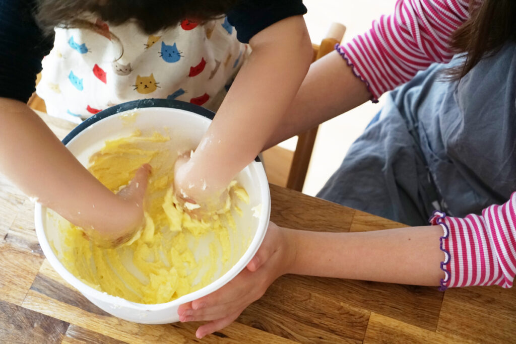 イチから子どもと一緒に作るのは結構疲れるので、普段は生地作りを自分で済ませておき、型抜きやこねて自由に形成する作業だけを子どもに任せることが多いです。