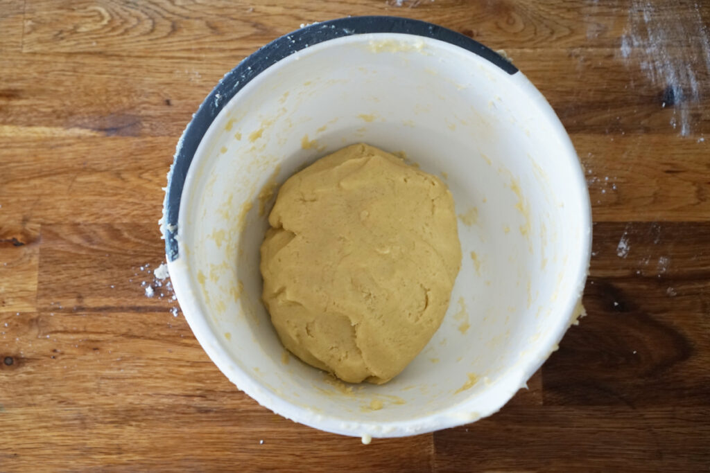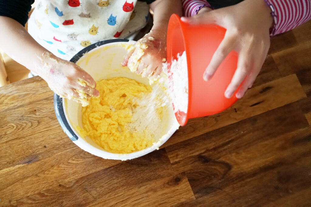 - 最後に小麦粉をいっきに入れ、生地が一つにまとまるまでこねます。