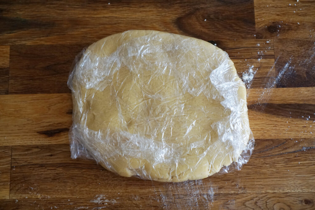 - まとめた生地をラップで包み、冷蔵庫で30分休ませます。