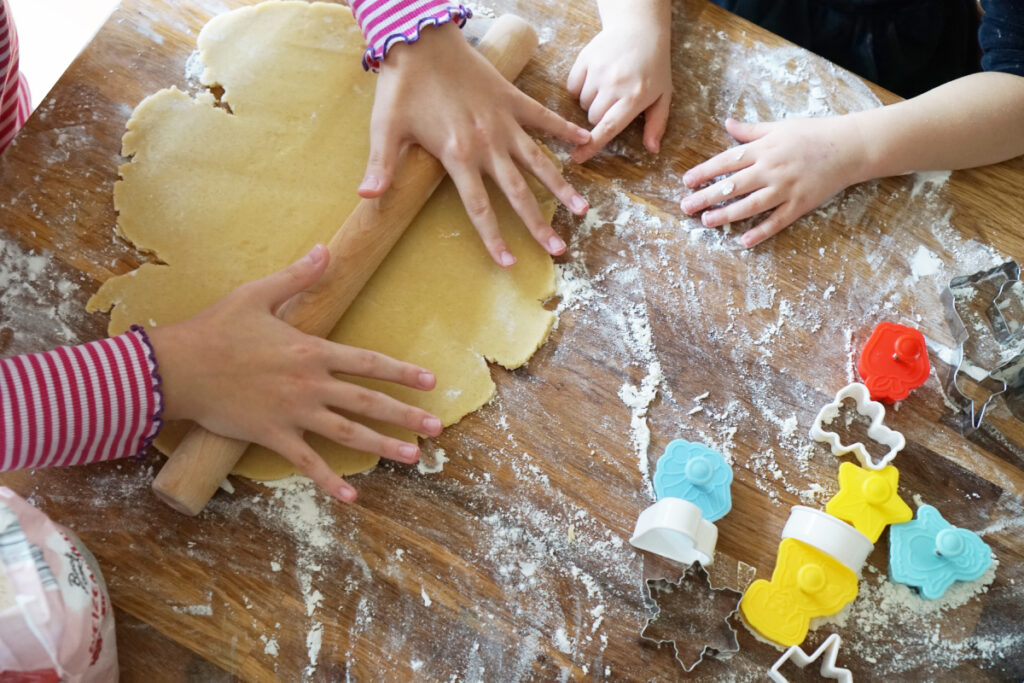 クッキーを作るとき、子どもたちは小さな役割を見つけて夢中になります。