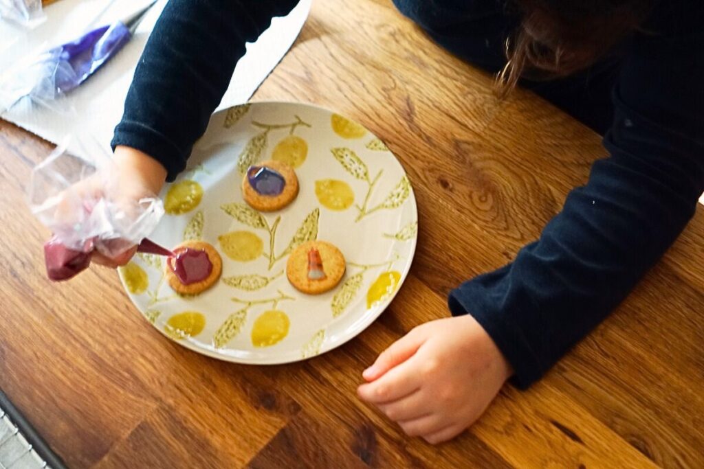 出来上がったクッキーをお友達にプレゼントするのも嬉しいようで、「あの子にはどれをあげようかな〜」と袋に入れる姿も楽しそう。