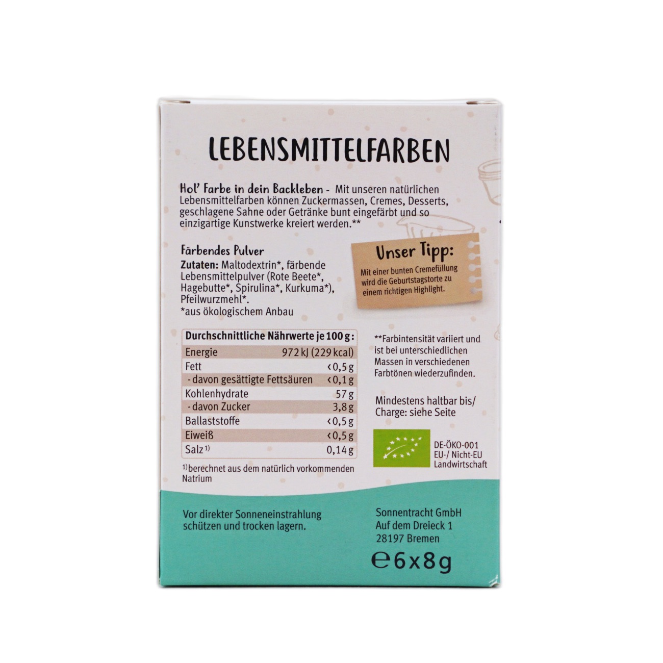 マルトデキストリン*、粉末食用色素(赤ビーツ*、ローズヒップ*、スピルリナ*、ターメリック*)、アロールート粉*