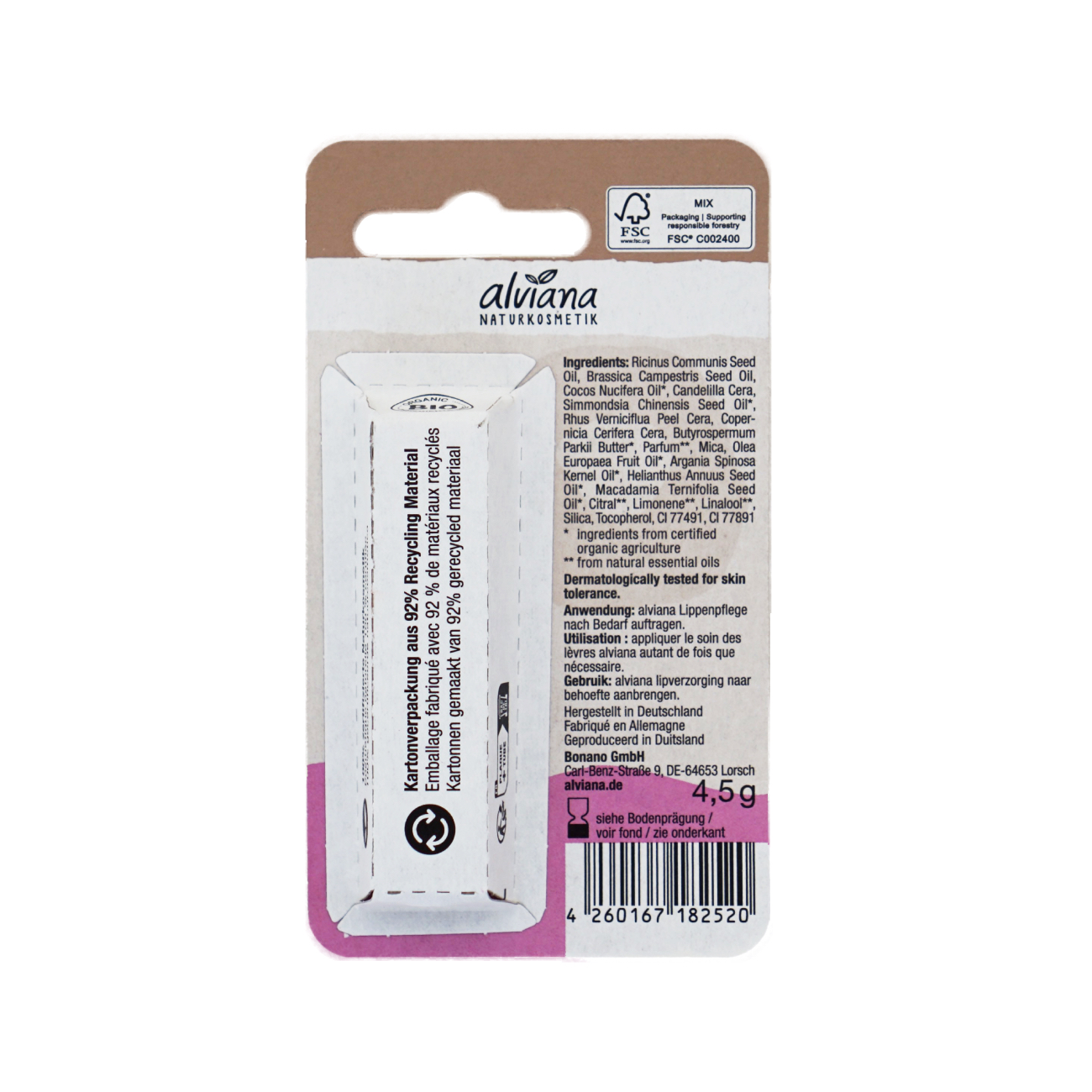 ヒマシ油、菜種油、ココナッツオイル*、カンデリラワックス、ホホバ油*、ウルシ果皮ロウ、カルナウバワックス、シアバター*、香料**、マイカ、オリーブ果実油*、アルガン油*、ヒマワリ種子油*、マカダミアナッツ油*、シリカ、ビタミンE、CI 77491、CI 77891