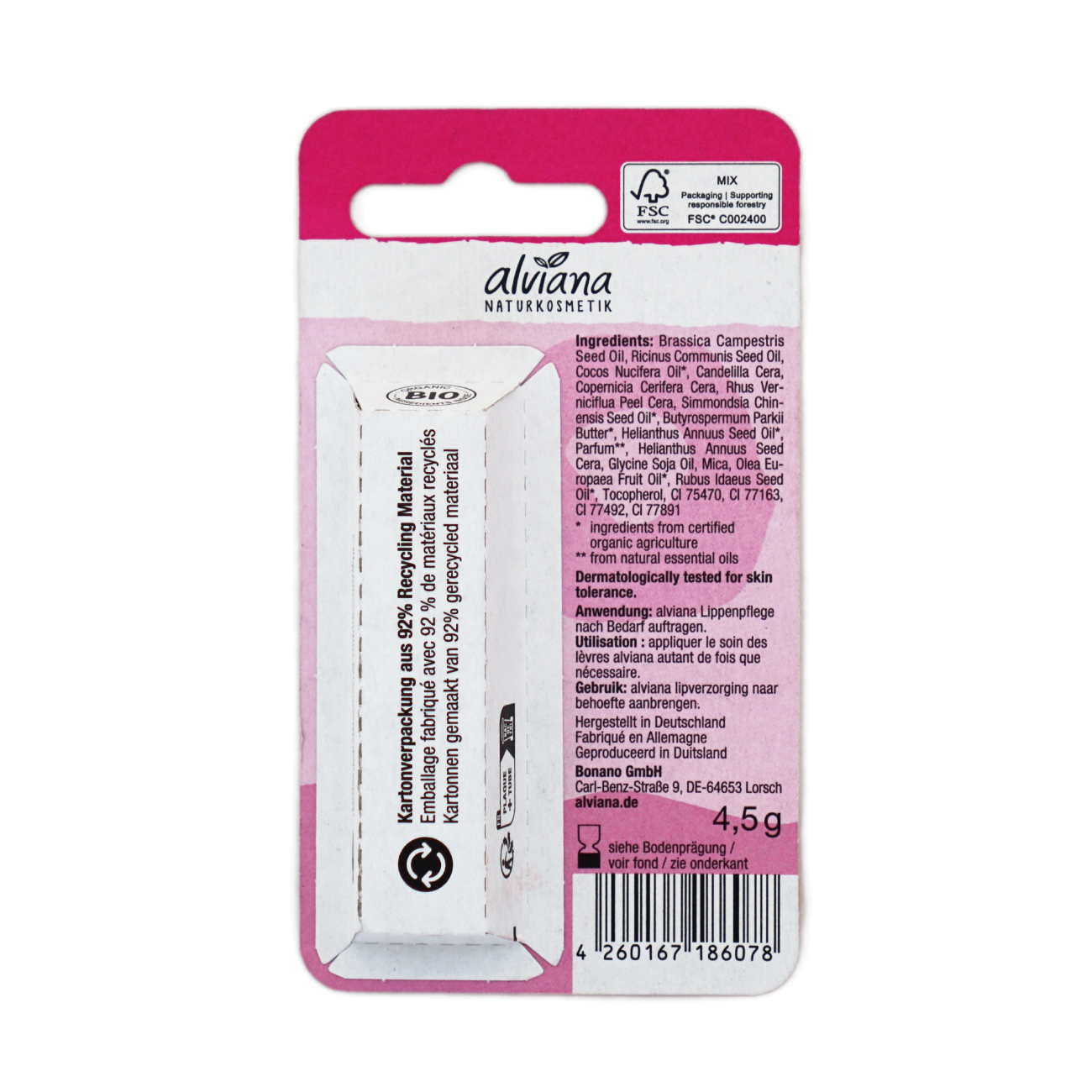 菜種油、ヒマシ油、ココナッツオイル*、カンデリラワックス、カルナウバワックス、ウルシ果皮ロウ、ホホバ種子油*、シアバター*、ヒマワリ種子油*、香料**、ヒマワリ種子ロウ、大豆油、マイカ、オリーブ果実油*、ラズベリー種子油*、ビタミンE、CI 75470、CI 77163、CI 77492、CI 77891