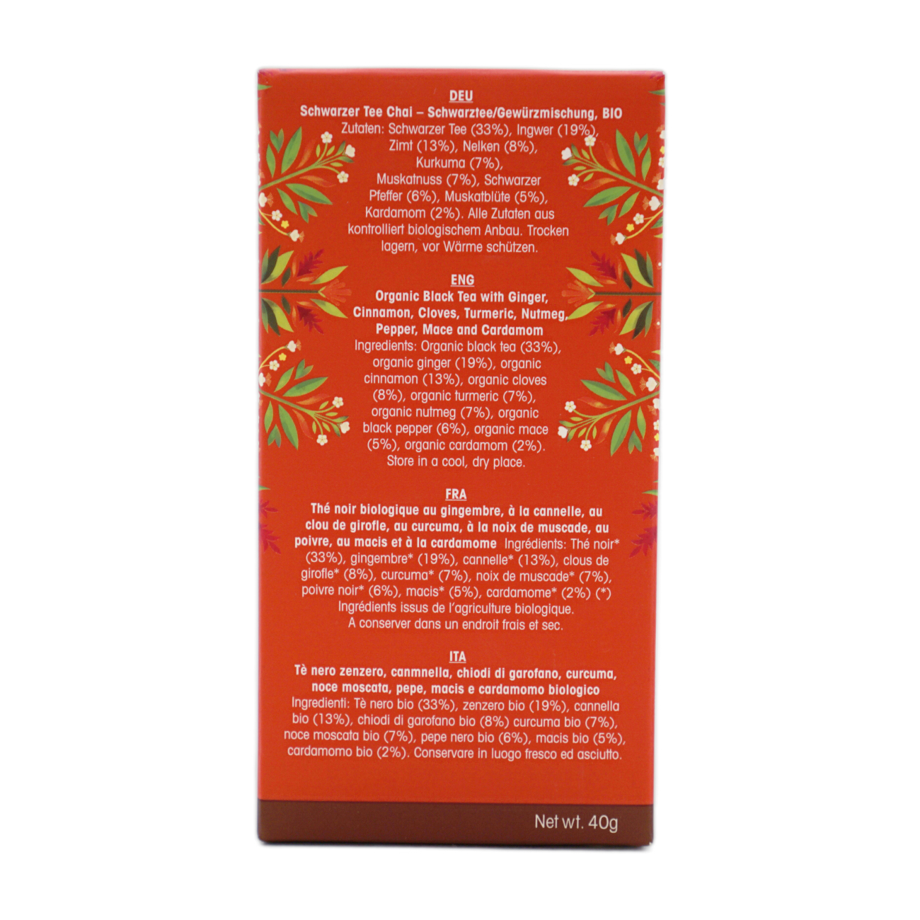 紅茶33%、ジンジャー(しょうが)19%、シナモン13%、クローブ8%、ウコン(ターメリック)7%、ナツメグ7%、黒こしょう6%、メース(ナツメグの花)5%、カルダモン2%