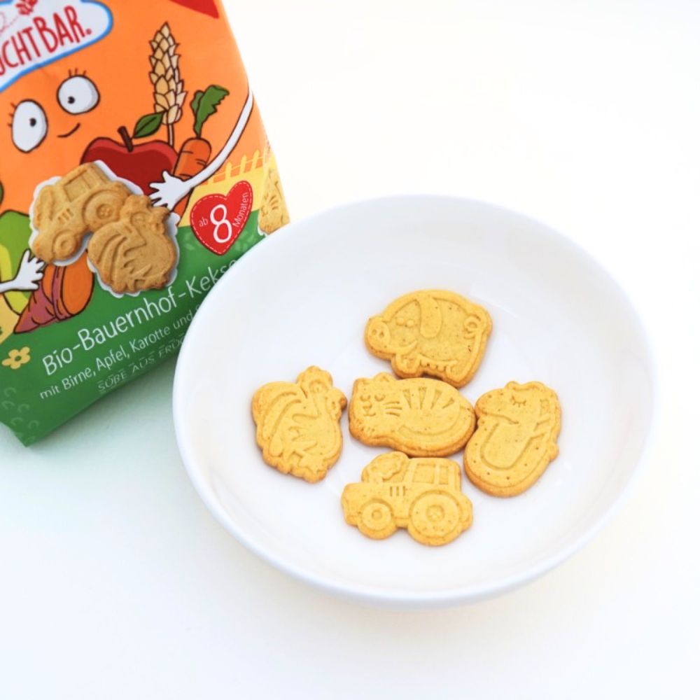 小麦粉*60%、濃縮りんご果汁*18%、ひまわり油*、小麦でんぷん*10%、洋梨ピューレ*3%、にんじん果汁*2%、さつまいもパウダー*1.5%、膨張剤(炭酸ナトリウム)、濃縮エキス(かぼちゃ、にんじん、りんご)*、ビタミンB1