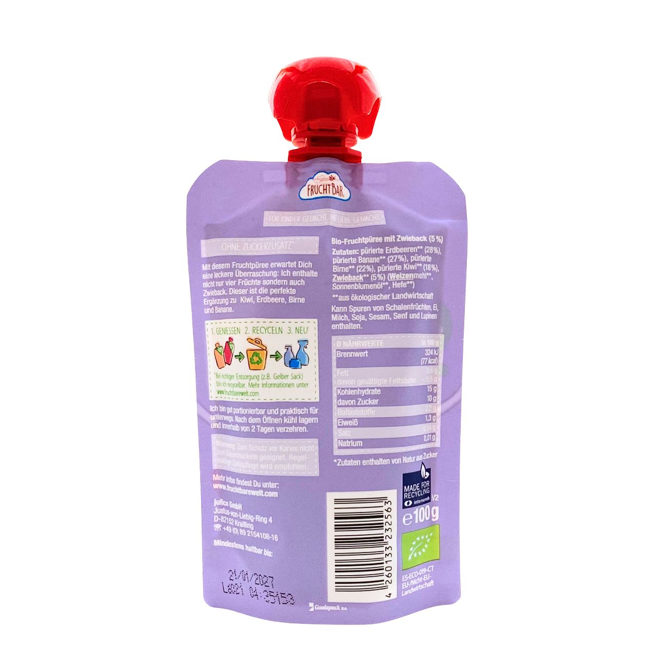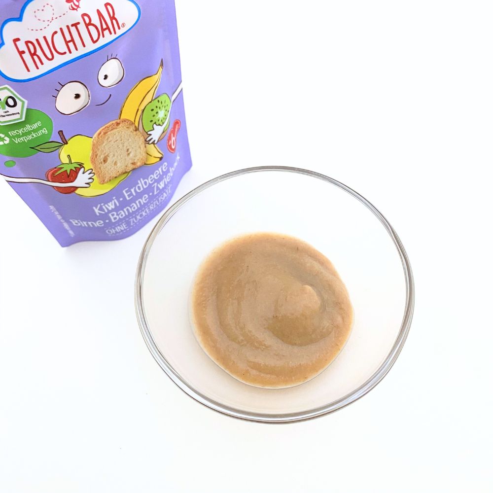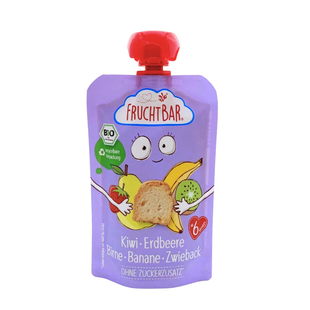 いちごピューレ*28%、バナナピューレ*27%、洋梨ピューレ*22%、キウイピューレ*18%、ラスク*(小麦粉、ひまわり油、酵母)5%