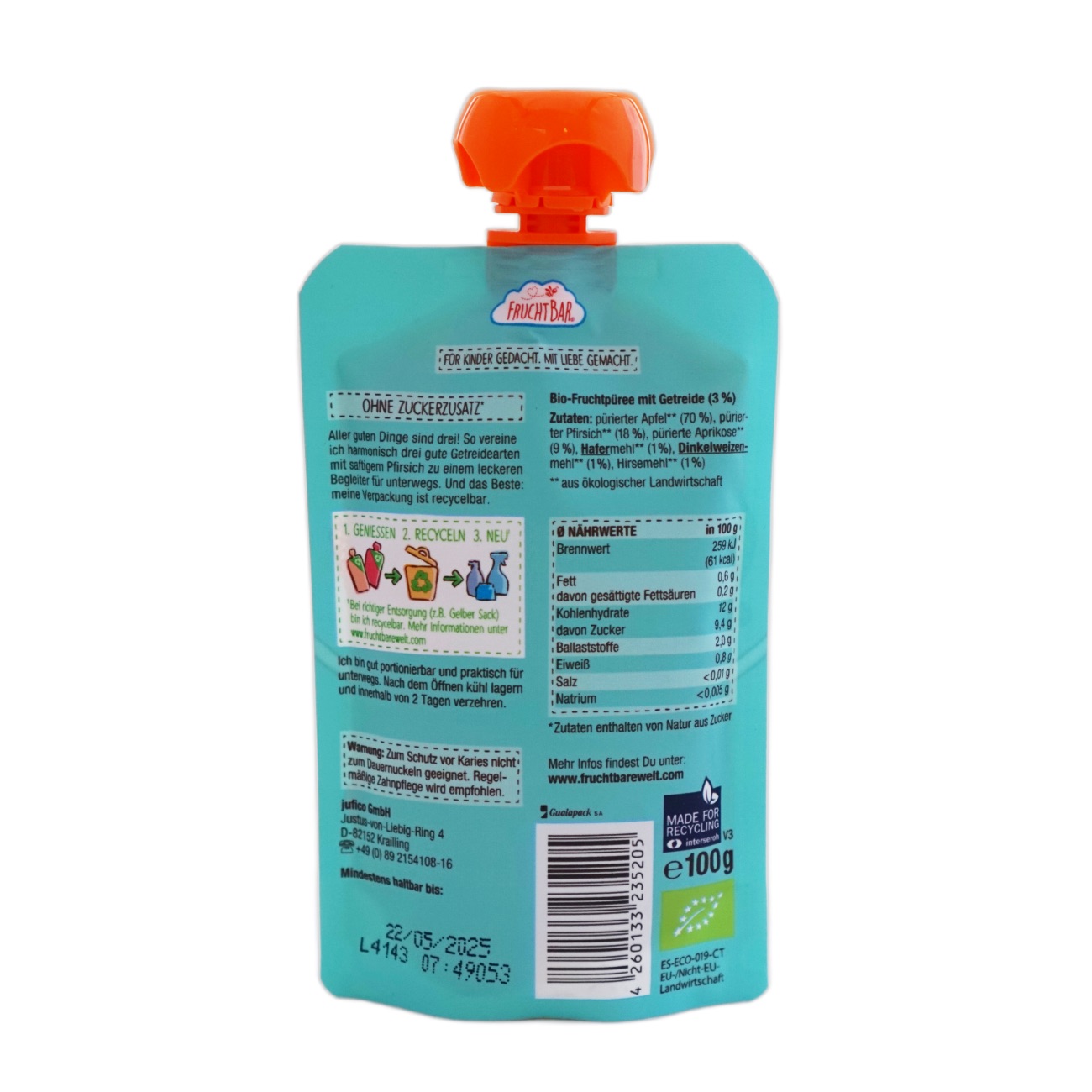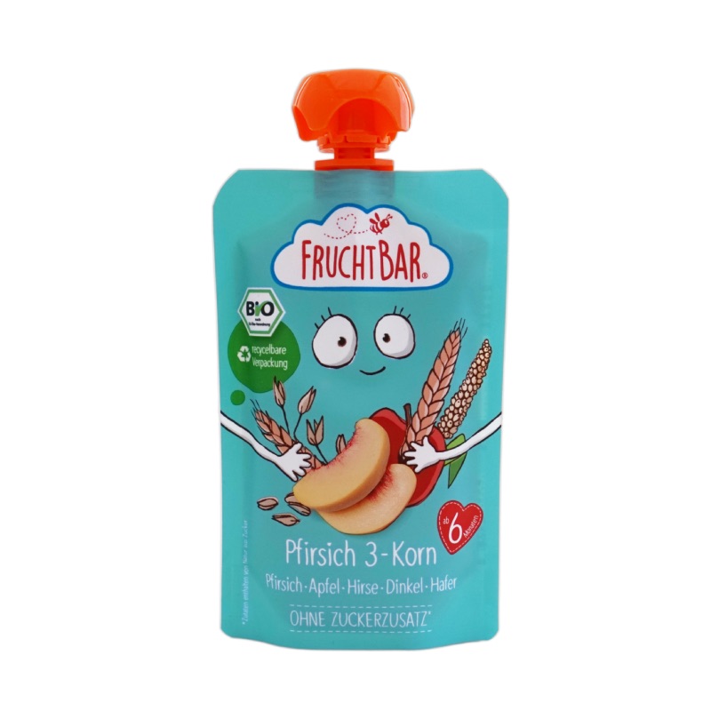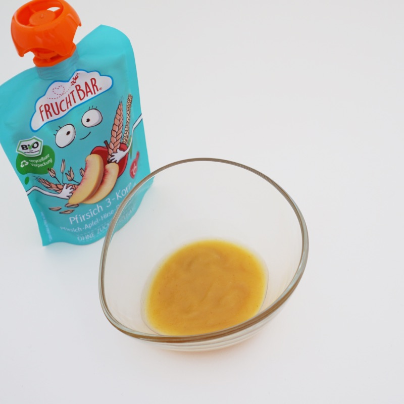 りんごピューレ*7o%、ももピューレ*18%、アプリコットピューレ9*%、オート麦粉*1%、スペルト小麦粉*1%、雑穀粉*1%