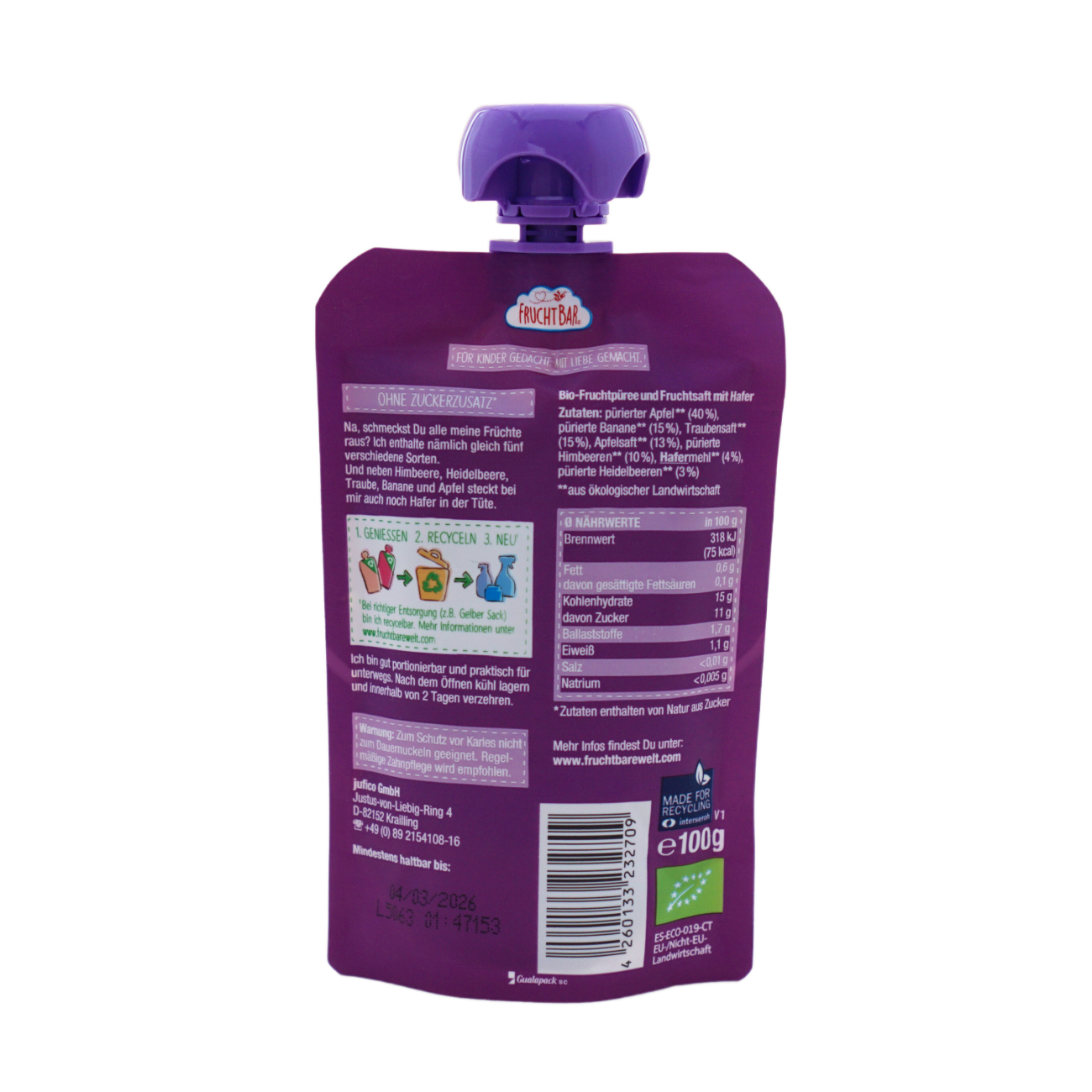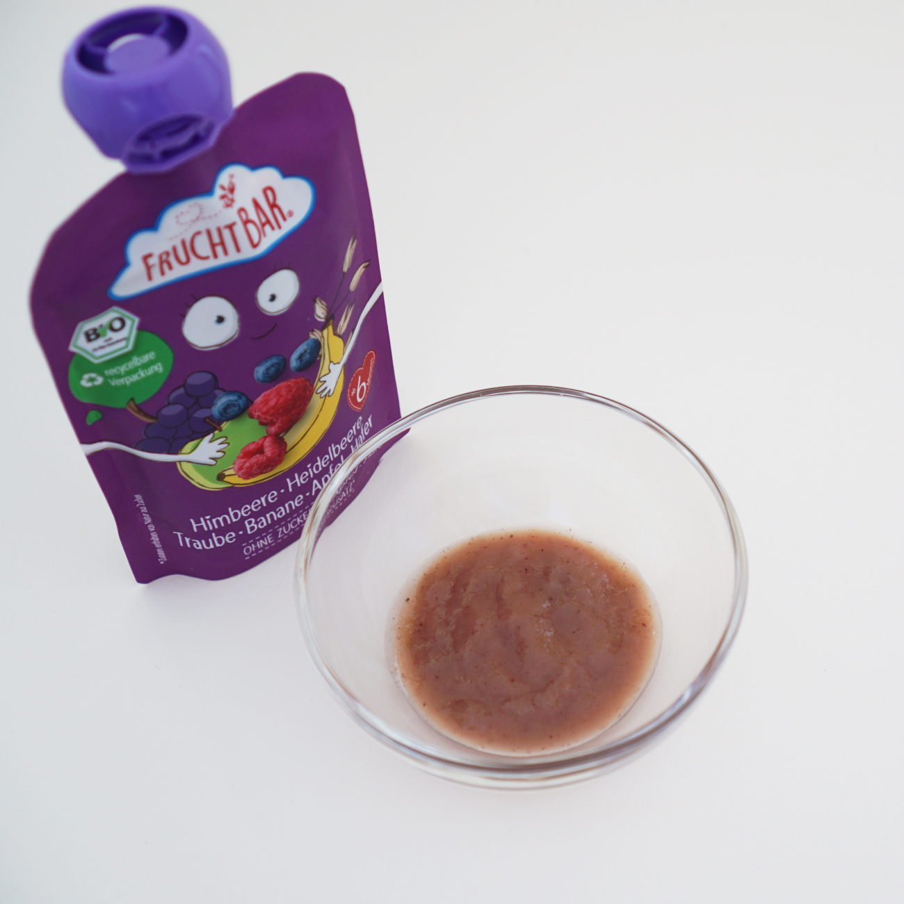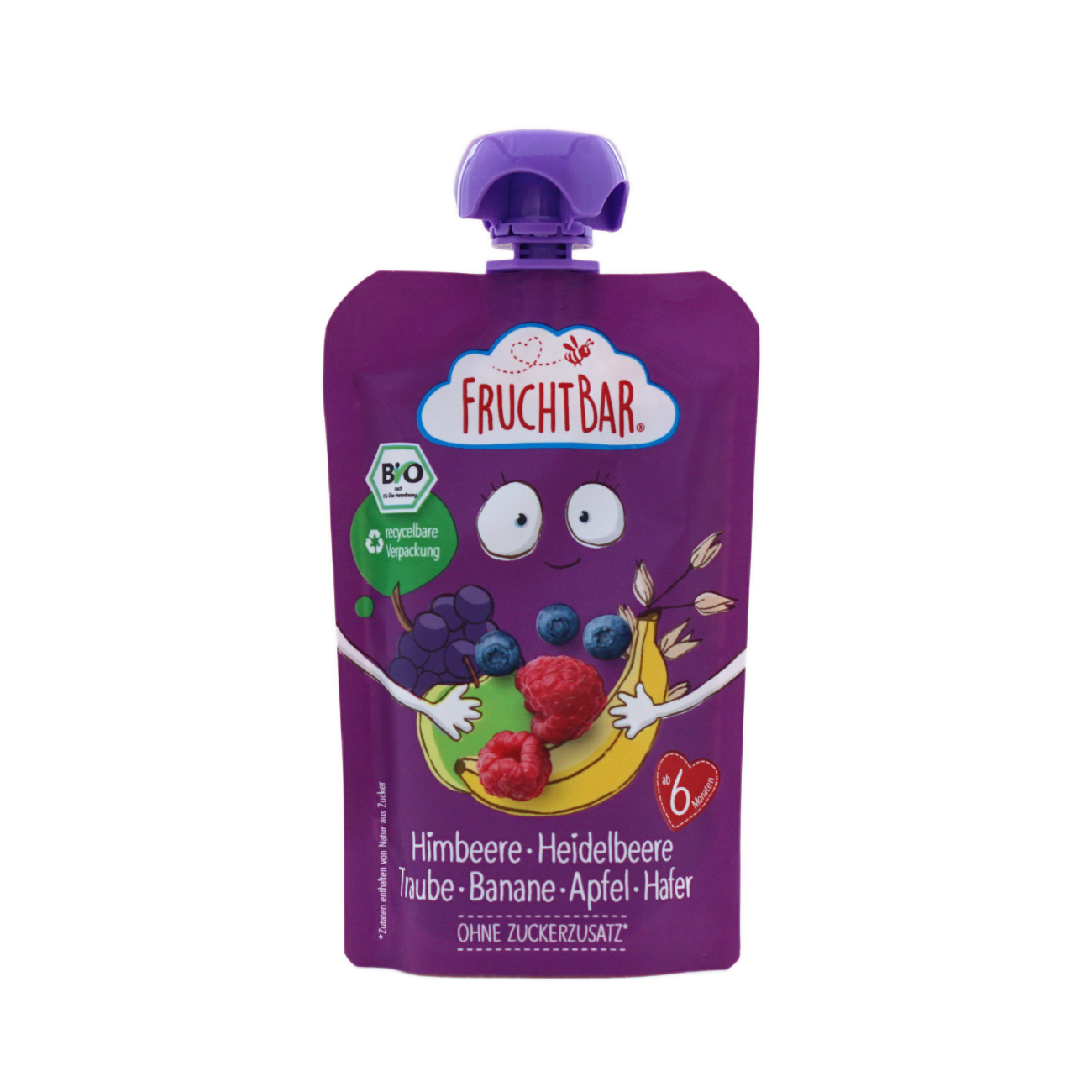りんごピューレ*40%、バナナピューレ*15%、ぶどう果汁*15%、りんご果汁*13%、ラズベリーピューレ* 10%、オートミール*4%、ブルーベリーピューレ*3%