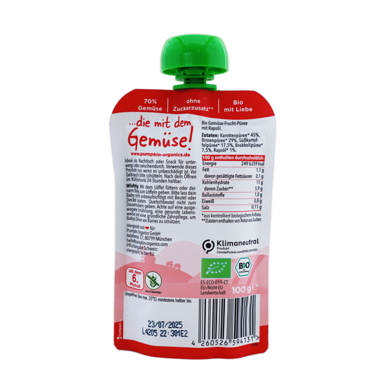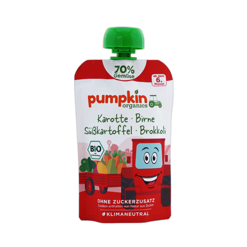 にんじんピューレ*45%、洋梨ピューレ*29%、さつまいもピューレ*17.5%、ブロッコリーピューレ*7.5%、菜種油*1%